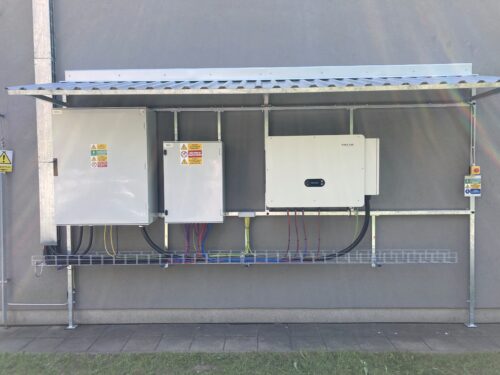 • Rozložení instalace:Střecha I.: 66 panelů, orientace jižní, zátěžový systém K2 S Dome 10°Střecha II.: 60 panelů, orientace jižní, zátěžový systém K2 S Dome 10°Střecha III. (sklad): 90 panelů, orientace východ/západ, systém K2 SpeedRail
