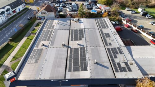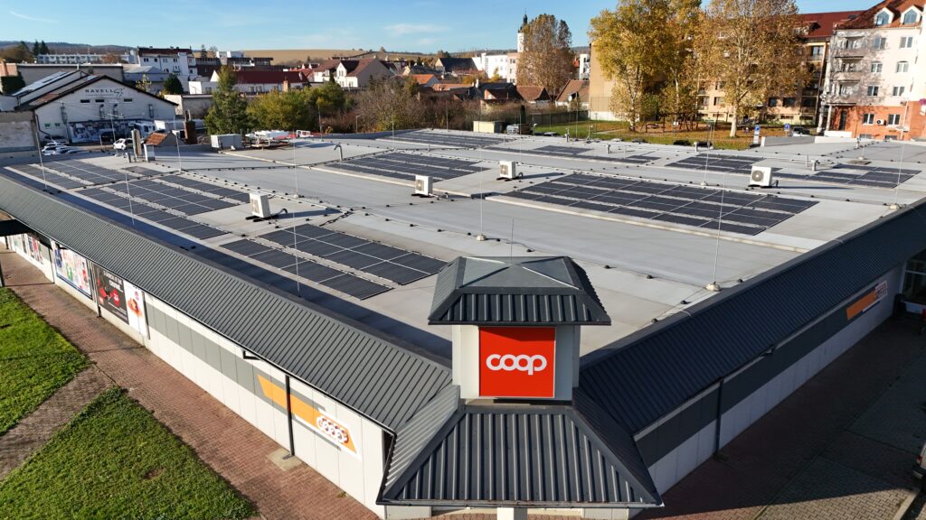 V roce 2023 jsme realizovali fotovoltaickou elektrárnu o výkonu 69,66 kWp pro prodejnu COOP v Kyjově. Projekt byl technicky specifický kvůli statickým omezením střechy, a proto jsme zvolili lehké flexibilní panely.